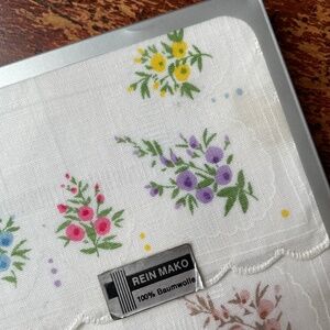 Three vintage cotton handkerchiefs made in Germany. Floral with scalloped edges. Still in their original box!
