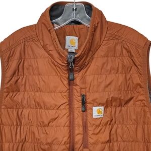 This Carhartt men’s insulated puffer vest comes in a rugged clay orangish‑brown color and features a warm, wind fighting technology, and durable design perfect for layering. It has a matching front zipper closure, two front snap‑closure pockets, and three interior pockets — one with Velcro, one with a zipper, and one vertical chest pocket with a zipper on the exterior for easy access.