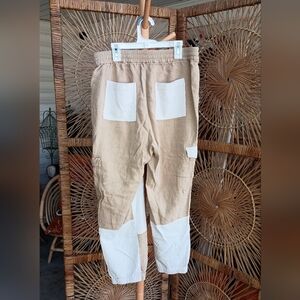 Stylish two-tone cargo pants featuring a blend of cream and tan colors. Perfect for casual outings.