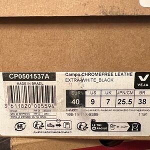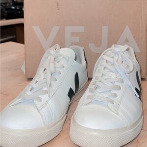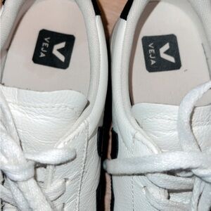 Stylish Veja sneakers. White leather with black accents. Comfortable and trendy.