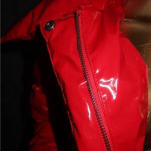Bold red puffer jacket with a glossy finish. Features a large collar and cozy fit. Ideal for cold weather.
