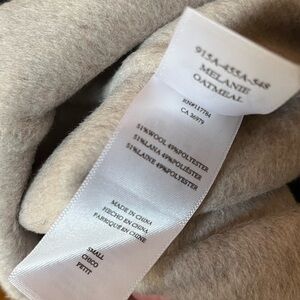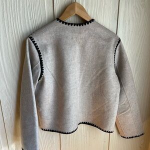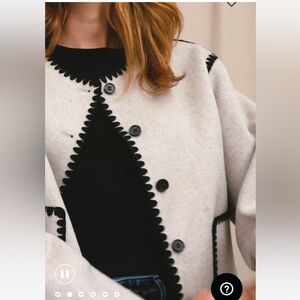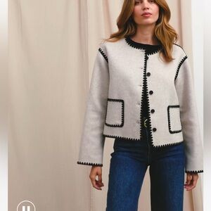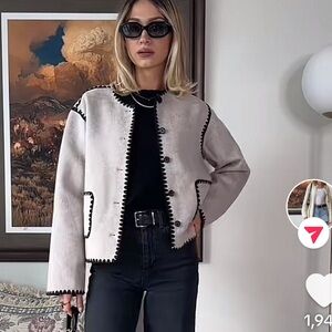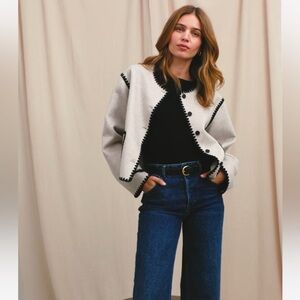 Elegant beige blazer with black accents. Features button closure and long sleeves. Ideal for a sophisticated look.