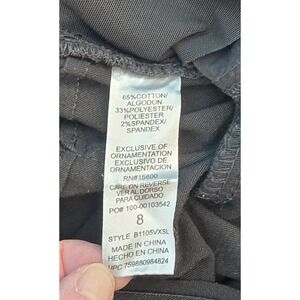 The product is a pair of Democracy Jeans in size 8 for women. These skinny jeans are in black and gray color with a mid-rise and an inseam of 26 inches. Made from a fabric blend of polyester, spandex, cotton, and cotton blend, they feature a zip closure, button accents, and a 5-pocket design. The jeans are designed for comfort and shaping, with stretchy elastic waist and are machine washable. Ideal for all seasons, they offer a slim fit and are part of the Democracy Ab Technology product line, known for their slimming and breathable properties.
