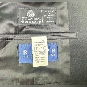 This Ralph Ralph Lauren Blazer Jacket in men's size 44L is a classic military-style buttons jacket in black with four-button sleeve closure and two-button front closure. Made from wool tweed fabric, it features inner pockets and a notch lapel. The jacket is designed for various occasions including party, casual, and business meetings. With a vintage look and designer theme, it offers a stylish and timeless addition to any man's wardrobe. Made by the renowned brand Ralph Lauren, this blazer exudes a sophisticated and classic aesthetic perfect for multiple seasons