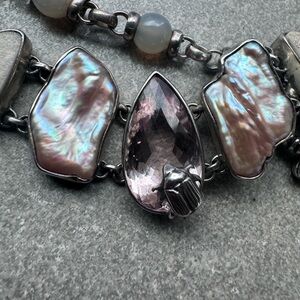 Amazing vintage 2003 Stephen Dweck necklace made from moonstone, Freeform pearl, opalized druzy and a massive eye clear brilliant cut rose quartz. It’s a one of a kind design marked by the scarab beetle !