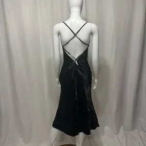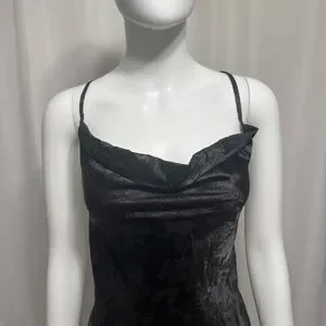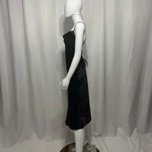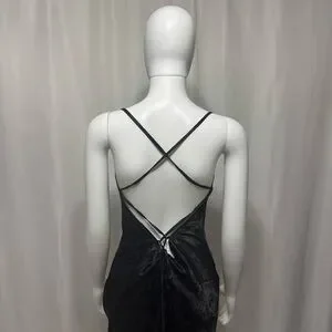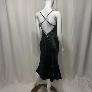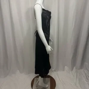This elegant black satin dress is perfect for any occasion. Its sleek design and silk feel fabric offer a sophisticated look.