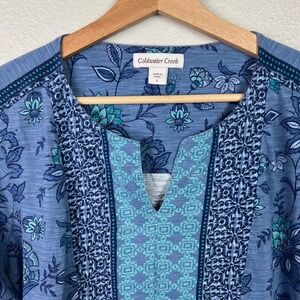 Coldwater Creek women's blue top showcasing a vibrant floral print. This 3/4 sleeve top features a flattering V-neckline with decorative trim and a comfortable, relaxed fit. The intricate pattern incorporates shades of blue and teal, accented by bands of geometric detailing at the neckline and cuffs. This versatile tunic is perfect for casual outings, weekend brunches, or relaxed vacation days.
