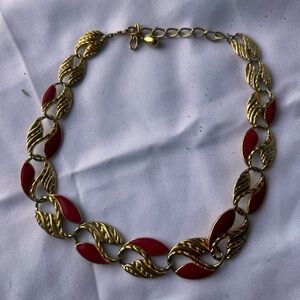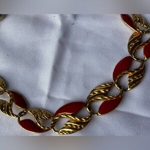 Vintage unsigned Choker Gold Toned Necklace Flex Omega Red And White Enamel
