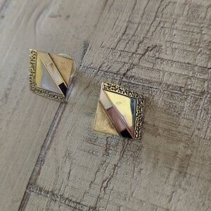 Pretty,unique vintage Native American mother of pearl,lapis and sterling silver earrings.The top portion of the earrings have a bend where the stones are in a raised channel.The last photo shows the back of the earrings with a ruler.Great contemporary look,yet classic vintage.Handcrafted and signed by the artist,RB.