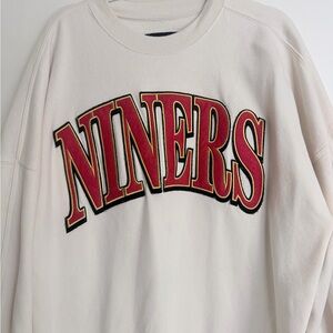 Cozy cream sweatshirt with bold Niners logo. Perfect for casual wear.
