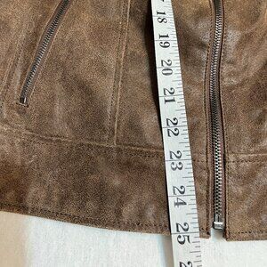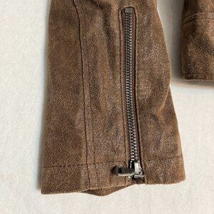 Classic Levi’s brown genuine leather jacket in a cafe racer / moto biker style. Made from real leather with a soft distressed finish that gives it a great vintage look. Fully lined interior, full zip front, zippered chest pockets, hand pockets, and zip cuffs.