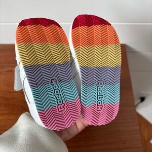 Chic Reebok sneakers with a vibrant rainbow sole. Easy velcro straps for quick wear. Good/great used condition. No big flaws, just show a little wear - please refer to pics for details