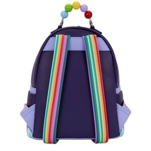 Colorful Inside Out characters on a purple Loungefly backpack. Features playful bead handle.