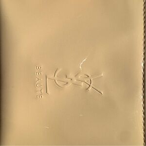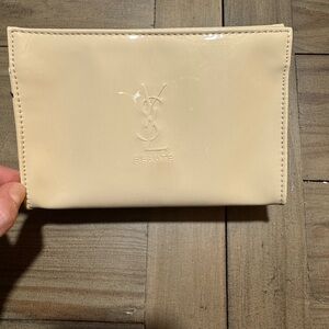 Elegant Yves Saint Laurent clutch. Smooth cream finish. Iconic logo embossed on front.