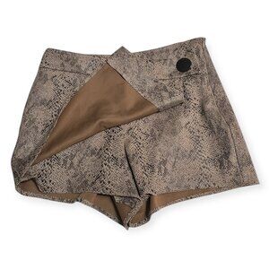 Stylish Zara Basic skort featuring an all-over snakeskin / reptile print with a high-waist wrap-front design. Looks like a mini skirt in front with built-in shorts underneath for comfort and coverage. Soft stretch fabric with side zipper and statement front button.