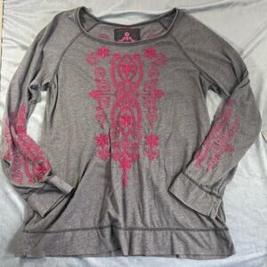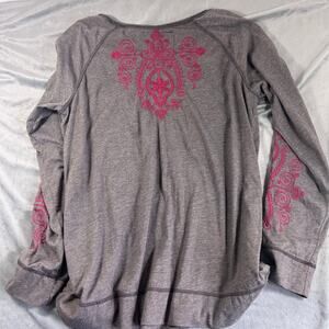 Stylish charcoal top featuring deep red like wine embroidery. Long sleeves with elegant detailing. Soft fabric for comfort.