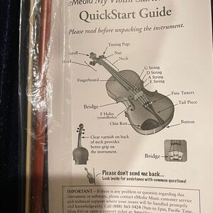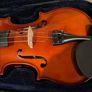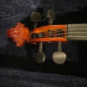 Beautiful wooden violin with a sleek black chinrest. Comes with a protective case and bow.