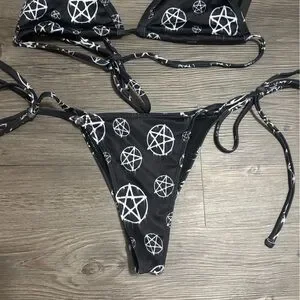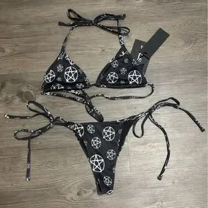 This bikini set includes a triangle bra top that has an all over pentagram print, back tie closures, and matching bottoms with side tie closures.