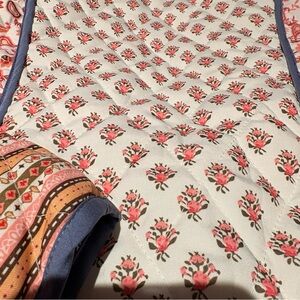 Reversible, Quilted, puffer Jacket featuring pinks, white, and olive green on the outside, blue flowers on the inside.