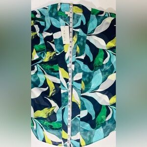 Details: blue, turquoise, white, green leaf pattern, sheer lightweight material, 100% polyester.