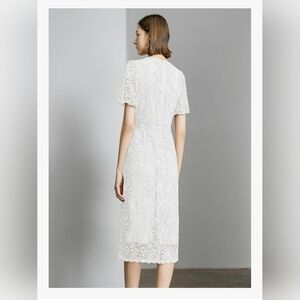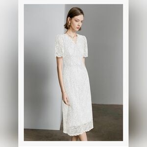 •The dress is designed with puff sleeves and elastic cuffs, giving it a playful yet elegant vibe. The overall silhouette is flattering, with a clean, simple cut that lets the intricate lace take center stage, creating a chic and romantic look.