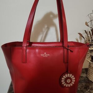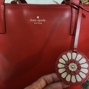 Kate Spade Cherry Red Leather Tote with Floral Charm EUC
