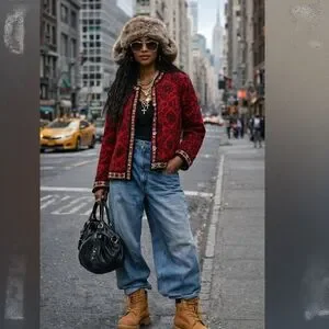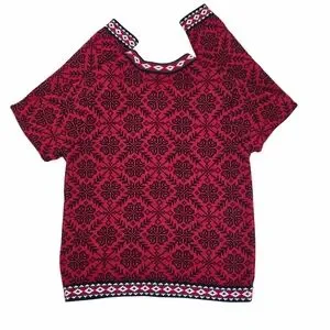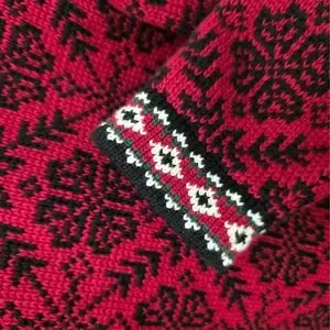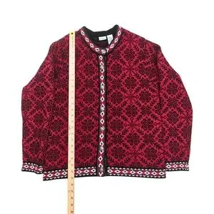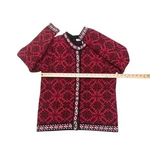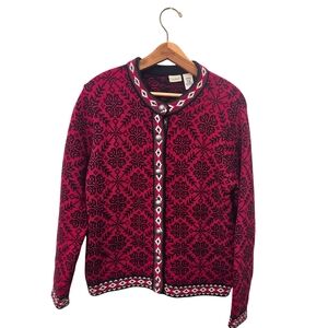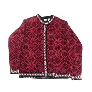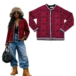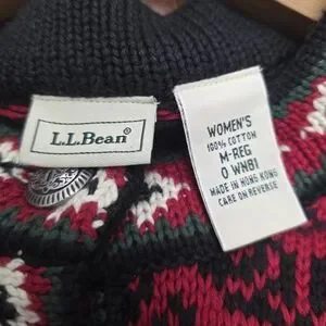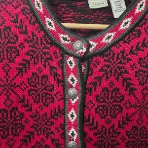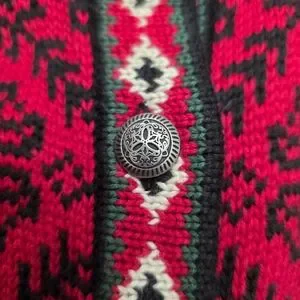 This vintage L.L. Bean cardigan features a classic Nordic snowflake-inspired motif in vibrant red and black with green and white accents. Made in Hong Kong from thick 100% cotton, it’s warm without the itch of wool and closes with pewter-toned buttons that echo traditional Norwegian design.
