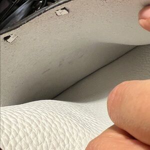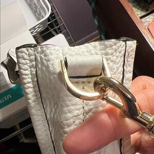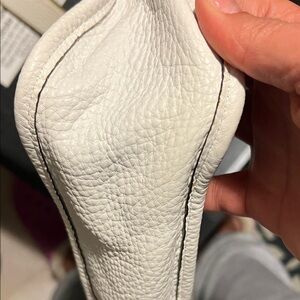 This elegant white leather shoulder bag is perfect for any occasion. Its sleek design and high-quality material make it a must-have accessory. The bag features a stylish studded front pocket for added flair. Removable, adjustable shoulder strap 36"-43", 17"-20" handle drop Tab-and-loop closures gold tone studs and hardware One outside open pocket Unlined 11"W X 10.5"H X 3.25"D some rubbing on side of strap see pics, but bag is flawless no scraps or tears, no transfer on bag