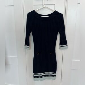 Tory Burch sweater dress, dark blue with gold details. Size small. Preloved in great condition. Measures approximately 14 inches pit to pit, 13 inches at the waist and 15 inches at hips. Very stretchy also.