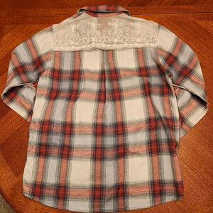 This pre-owned BDG women's button-down shirt in size M features a red, white, and grey plaid pattern. The shirt has a full button-front closure with brown buttons, a single chest pocket, and buttoned cuffs. A white lace-like mesh panel with embroidered floral designs is visible on the upper back and extends to the inner collar. The care tag indicates a shell of 100% cotton and trim fabric of 100% polyester, with machine wash cold instructions.