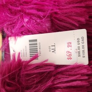 NWT, super hot pink, so soft and never worn. One Size fits most. Layers of soft faux shag w beautiful pink satin lining. Hook/clasp front closures as well as two snap buttons on each side to create a more secure bolero style jacket around each arm. Bright and fun for these dark, gray winter days. Pet and smoke free home.