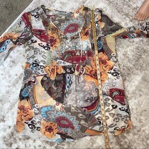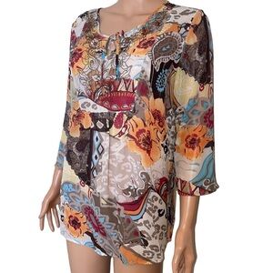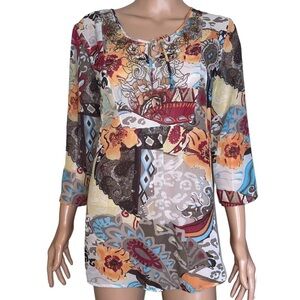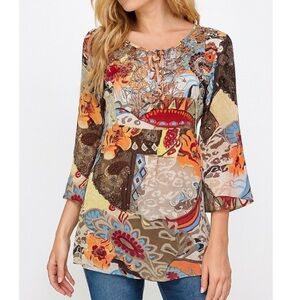 boho patchwork tunic top, floral paisley blouse, multicolor bohemian top, 3/4 sleeve blouse, lace-up neckline tunic, artistic print shirt, hippie style blouse, fall fashion top, festival boho chic shirt, flowy lightweight blouse, colorful abstract print tunic, casual long sleeve top, ethnic pattern blouse, women’s artsy top