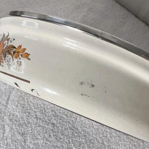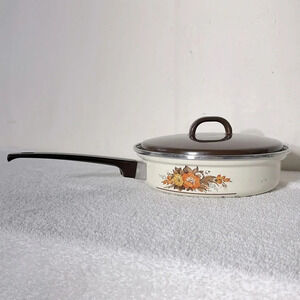 Great vintage condition. Minor signs of wear shown in pics. Please look at all pics and zoom in for a closer view. Measurements in pics. Vintage Enamelware Autumn Flowers Skillet Frying Pan With Lid GBE
