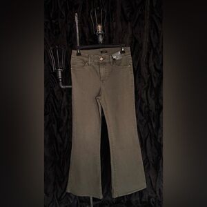Express 70's flare, mid rise, flexx hyper stretch. Dark olive green