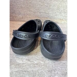 This product is a pair of women's black Crocs in size 7. They feature a low top style with a slip-on closure, making them easy to wear. The shoes are made of rubber with a synthetic lining, making them comfortable for casual occasions. They have a solid black color with the Crocs logo as accents. These clogs are suitable for walking and can be worn in the summer, fall, and spring seasons. The standard shoe width ensures a comfortable fit for everyday wear.