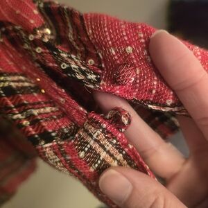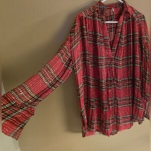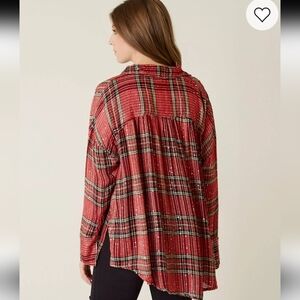 NWOT Free People fearless love pullover top. Long sleeve, sparkle, plaid. Size XS. Oversized fit. Center to one pit is 16" so pit to pit approx 32". High Low hem.