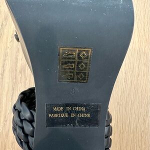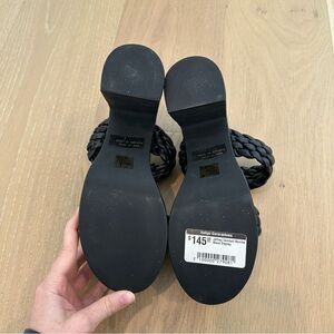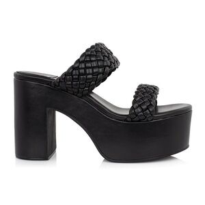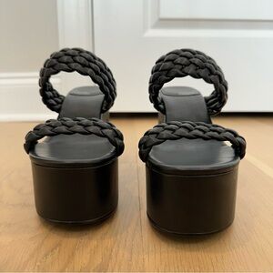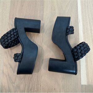 Features: Chunky black platform sandals, braided straps, ~4.25” heel, ~2.25” platform, brand new,