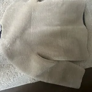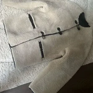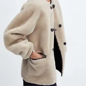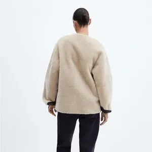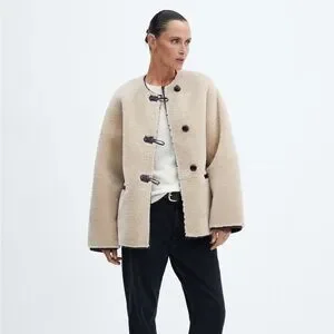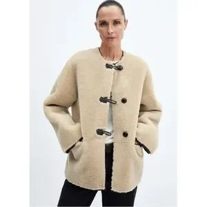 Cozy teddy jacket by Mango. Features a soft tan color. Toggle closures and side pockets. Perfect for layering.