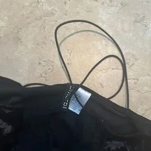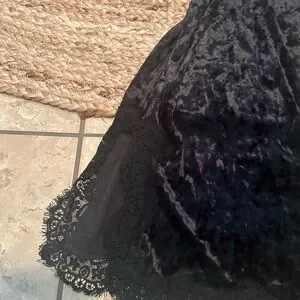black soft velvet slip dress with spaghetti straps and lace trim midi length