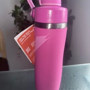 Bright pink water bottle with a convenient handle. Ideal for hydration on the go.