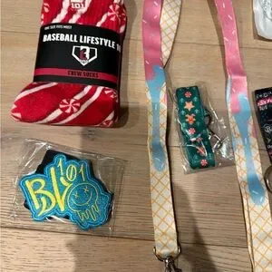 Set includes red Baseball Lifestyle socks, lanyards, and keychains. Perfect for sports enthusiasts.