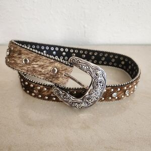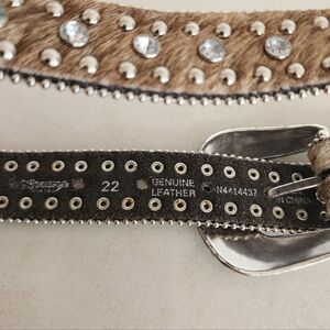 Nocona Brown Cowhide Hair On and Silver Rhinestone Studded Western Belt Size 22in Excellent Condition