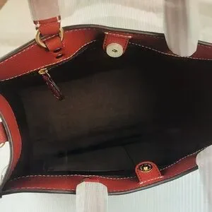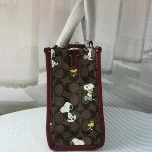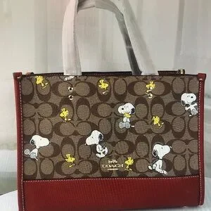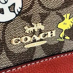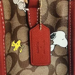 Charming Coach shoulder bag with Snoopy and Woodstock design. Features brown and red tones. Ideal for casual outings.