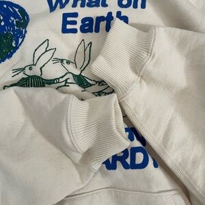 Cream hoodie with bold blue text and graphic. Features playful rabbit design. Comfortable and stylish.