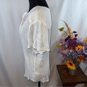 Beautiful Como Vintage ivory peasant blouse featuring delicate boho floral embroidery, a soft crinkled texture, and an adjustable tie-neck detail for a flattering, relaxed fit. Lightweight and breathable—perfect for spring, summer, and fall layering. Effortless bohemian cottagecore style that pairs perfectly with denim, linen pants, or skirts for casual days or festival vibes. Ideal for spring and summer wear, this boho cottagecore embroidered blouse transitions beautifully into early fall with layered looks.