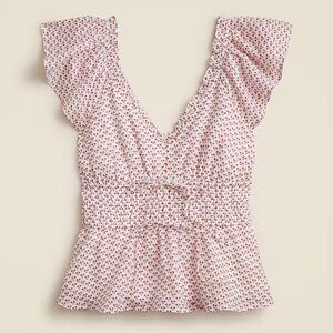 J. Crew Palermo Top in Ramie Ivory Red Print size Small Flutter Sleeve Blouse.