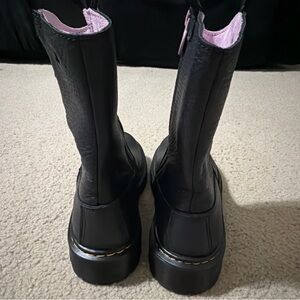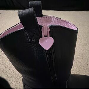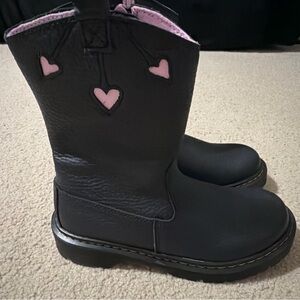 These are brand new without the box. The product is a pair of Dr. Martens Girls 3 Bex Heart Cut-Out Cowboy Boots in black leather with a zipper closure. These mid-calf boots feature a round toe, low heel, and are accented with hearts, a zipper, and the Dr. Martens logo. They are designed for various occasions including travel, activewear, casual outings, formal events, and more. The boots are cushioned, waterproof, non-slip, and comfortable, making them suitable for year-round wear. With a Western style and a blend of alternative, punk, and cowboy themes, these boots are perfect for young girls looking to add a touch of edgy flair to their outfit.