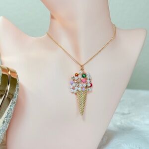 This stunning gold ice cream cone pendant necklace is a playful addition to any jewelry collection. Featuring a mix of colorful accents, it adds a touch of whimsy to your style.