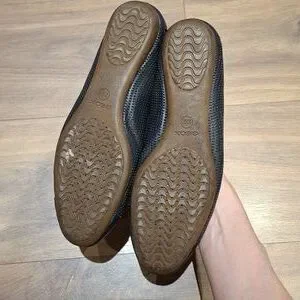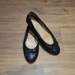 Beautiful, classic navy leather ballet flats from quality shoemaker, Geox; perforated Italian patent leather - breathable, comfortable, and supple; features capped toe design and bow tie detail; little to no wear on soles