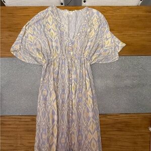Keywords: Cost Plus World Market, Mira Dress, Kaftan, Caftan, Ikat Print, Bohemian, Boho Chic, Festival Wear, Beach Coverup, Resort Wear, Summer Dress, Geometric Pattern, Purple and Yellow, Tassel Ties, Flowy Dress, Relaxed Fit, Kimono Sleeve, Travel Outfit, Hippie, Artsy, Wearable Art